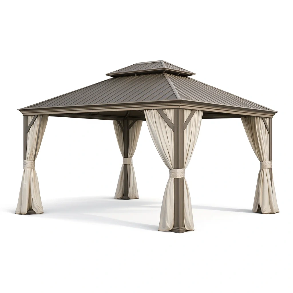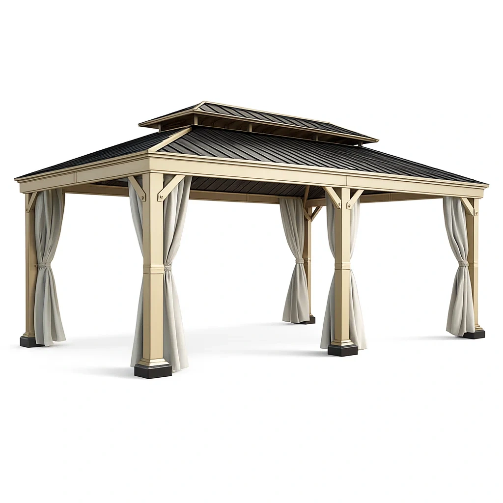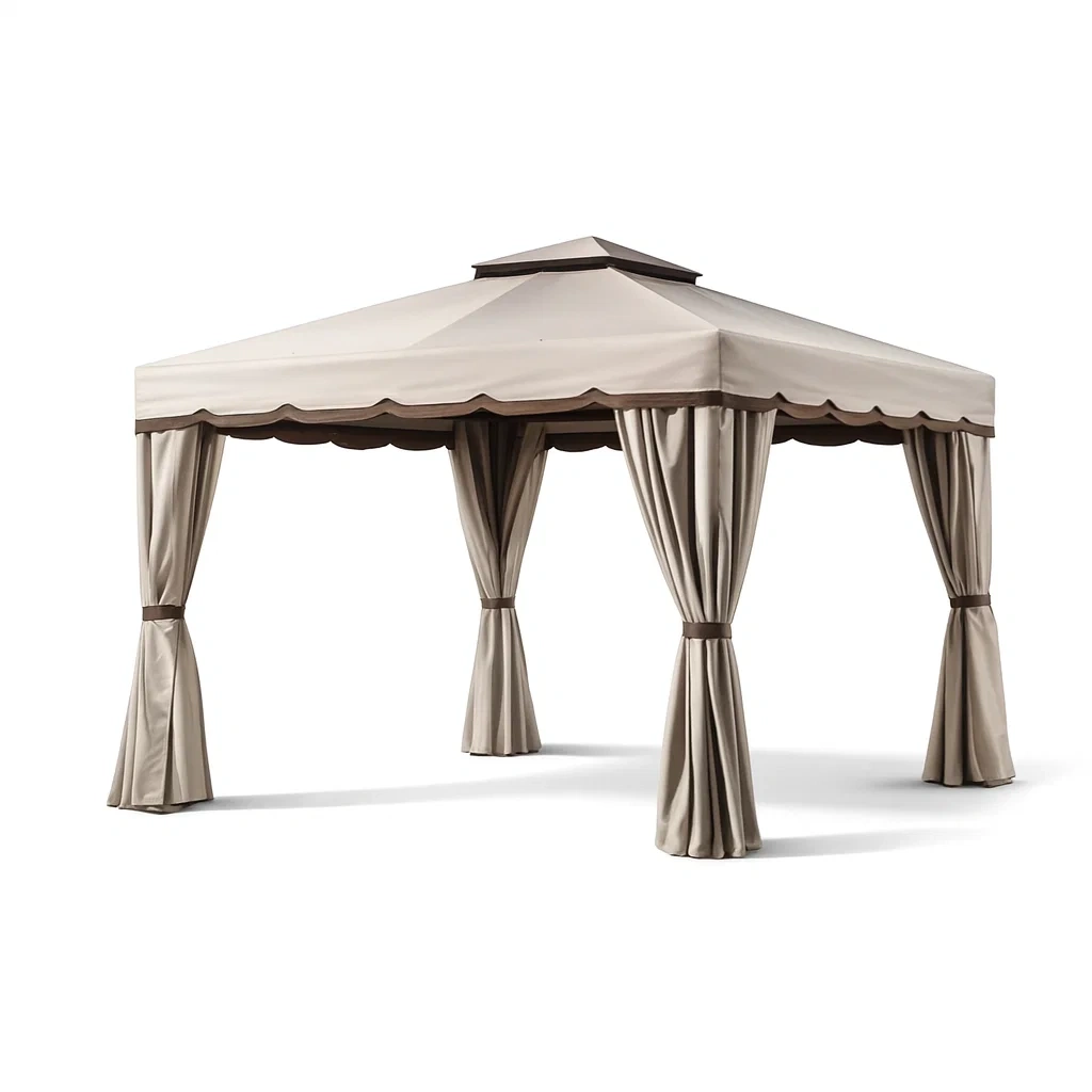 Pavillon aus aluminium mit stahldach und polyester vorhängen beige