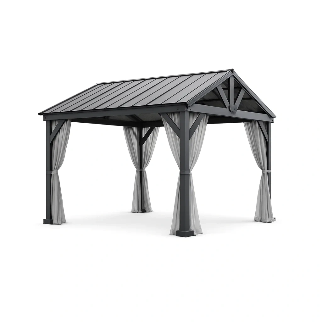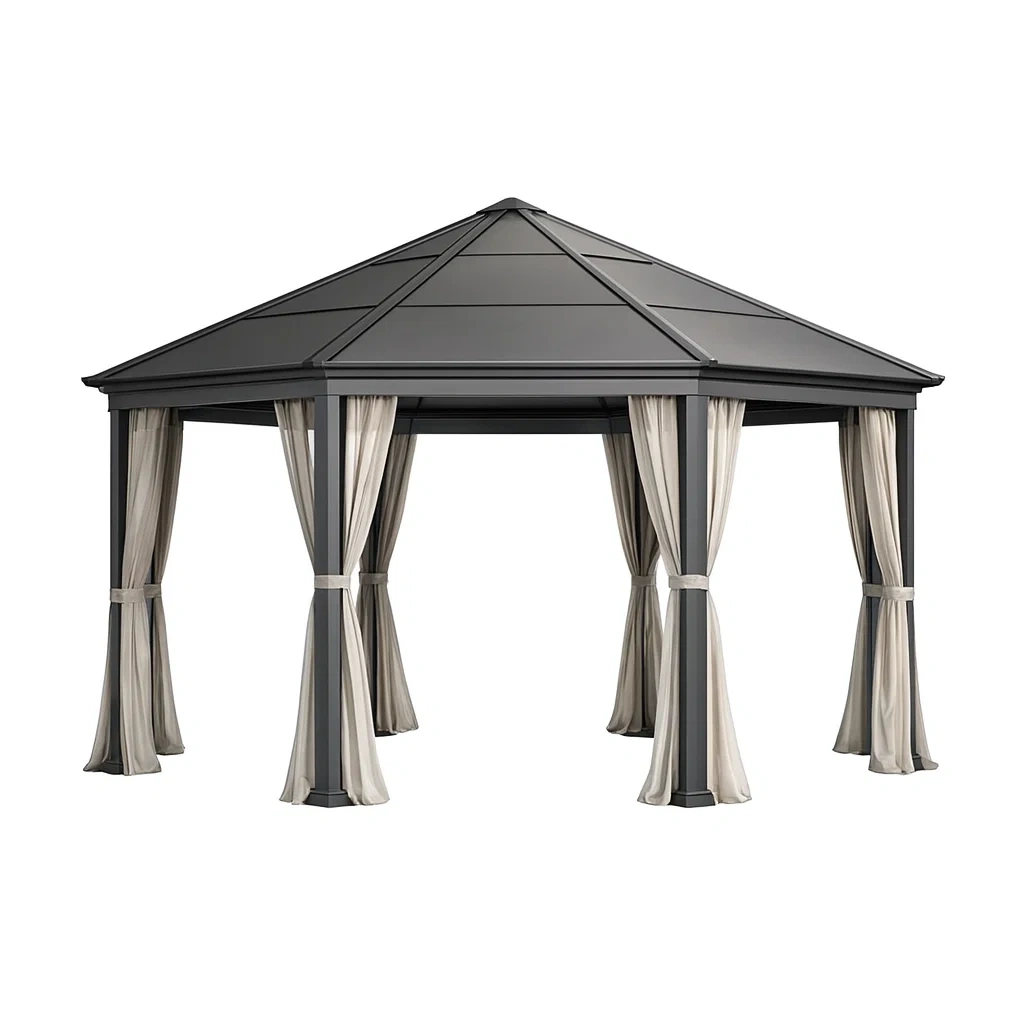 Pavillon aus aluminium mit stahl-dach und polyester-vorhängen grau