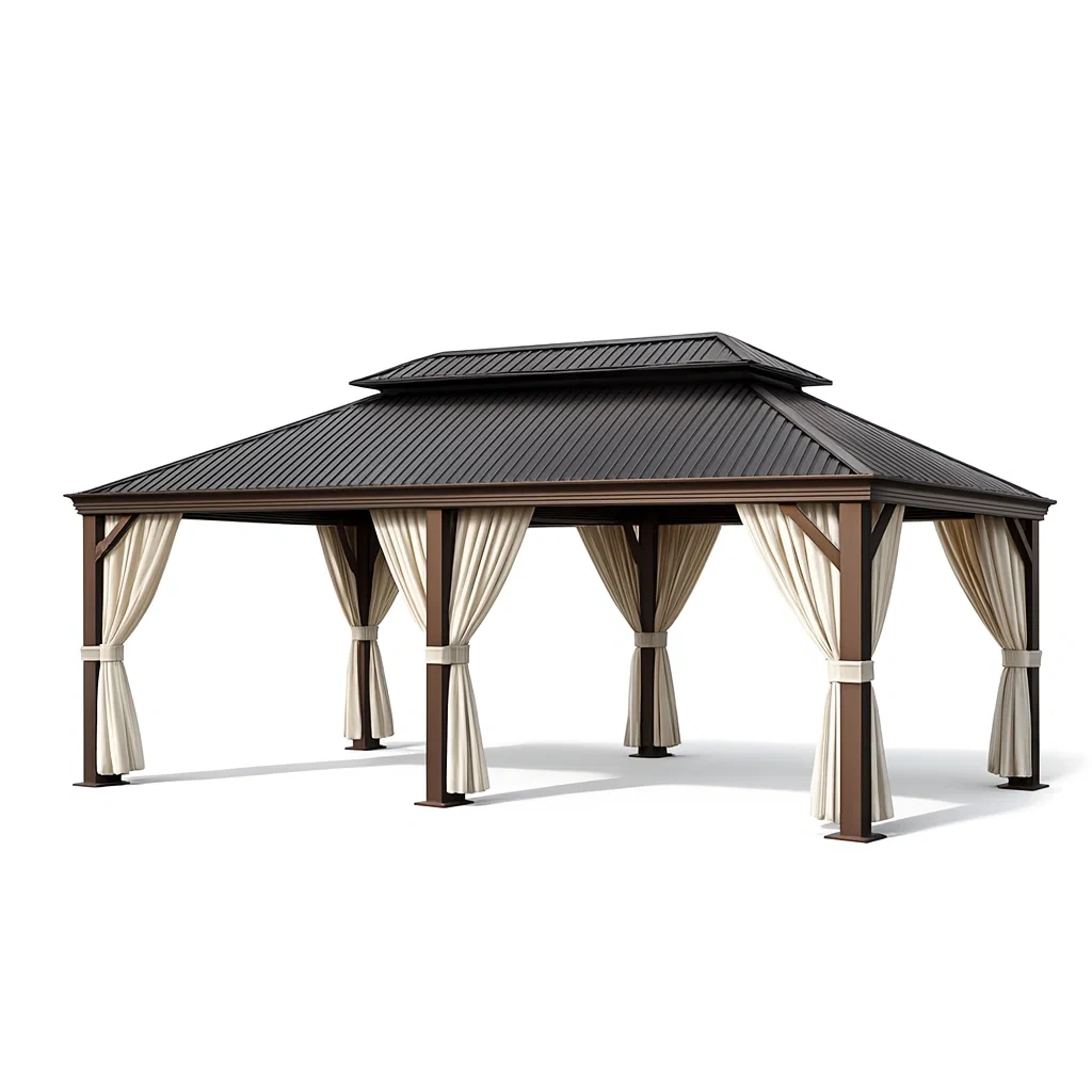 Pavillon aluminium mit stahldach und polyester vorhängen braun/beige